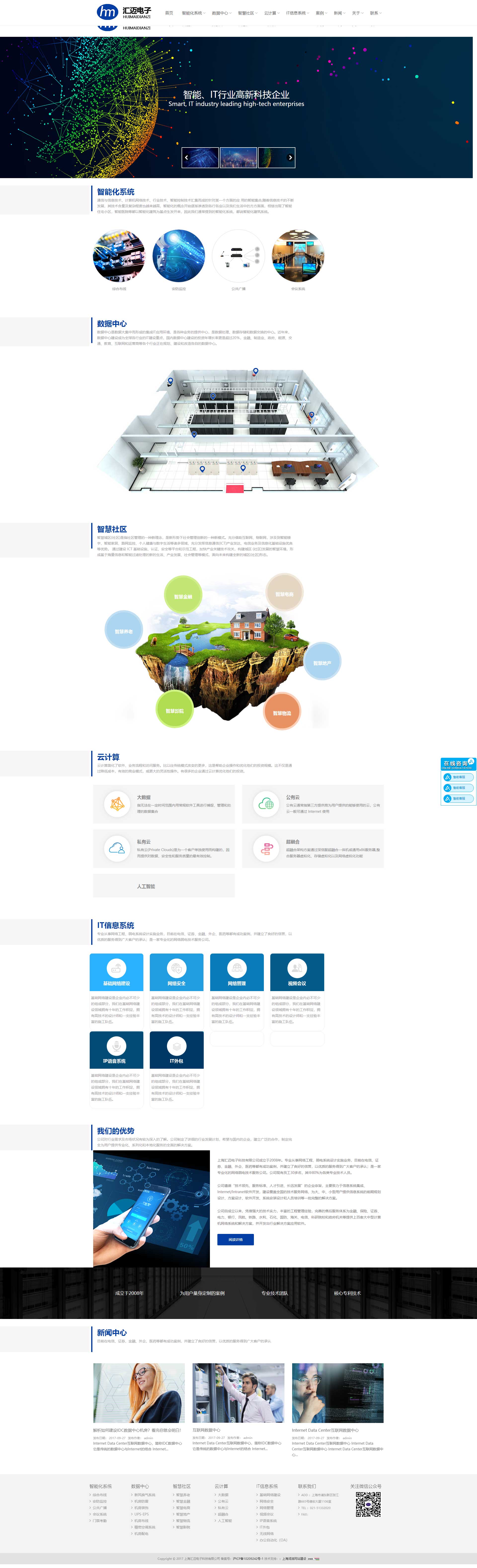 上海汇迈电子科技有限公司成立于2008年。专业从事计算机网络系统集成、智能化工程、智慧城市、云计算、大数据。