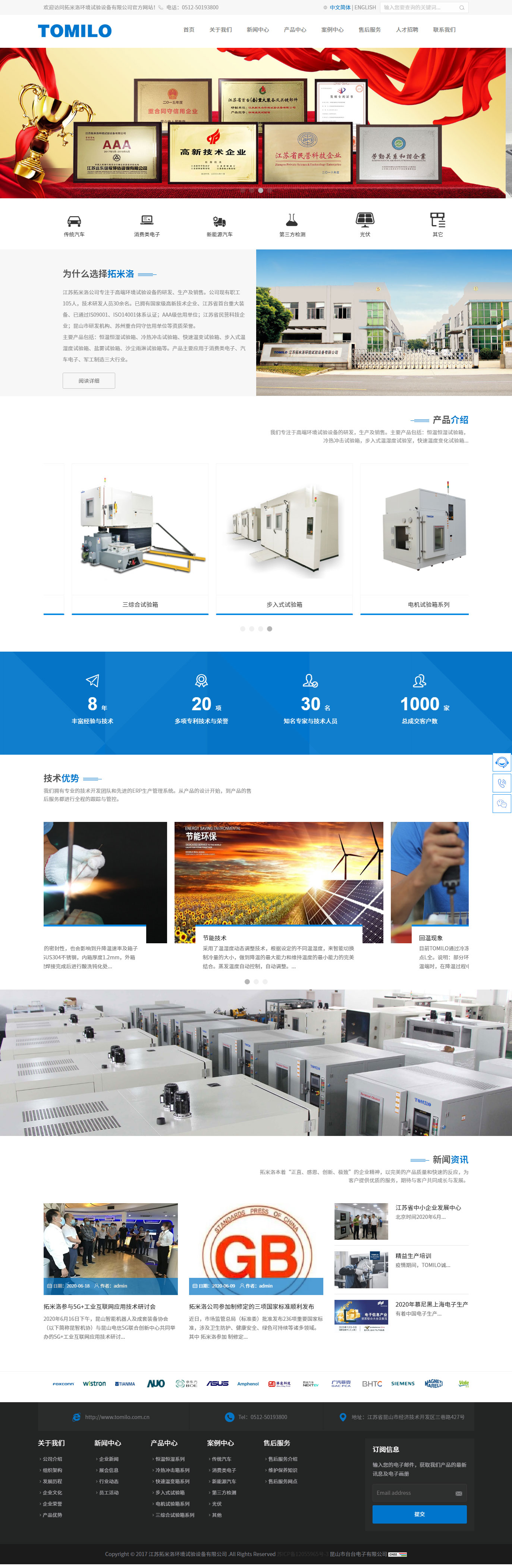 江苏拓米洛环境试验设备有限公司专注于高端环境试验设备的研发、生产及销售。公司现有职工155人,技术研发人员40余名。已拥有国家级高新技术企业、江苏省首台重大装备、已通过IS09001、ISO14001体系认证;AAA级信用单位;江苏省民营科技企业;昆山市研发机构、苏州重合同守信用单位等资质荣誉。